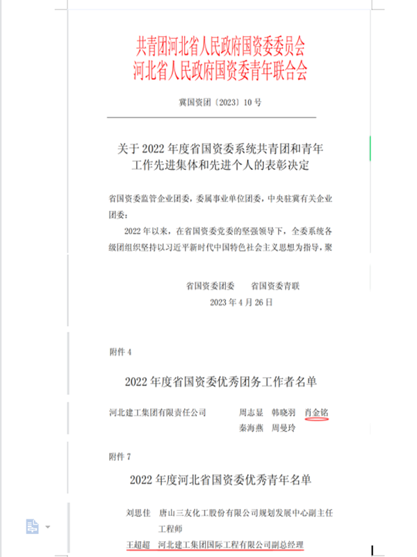 近日,省国资委团委、省国资委青联联合表彰了2022年度省国资委系统共青团和青年工作先进集体和先进个人,国际公司两名职工分获“2022年度河北省国资委优秀青年”和“2022 年度省国资委优秀团务工作者”荣誉称号。