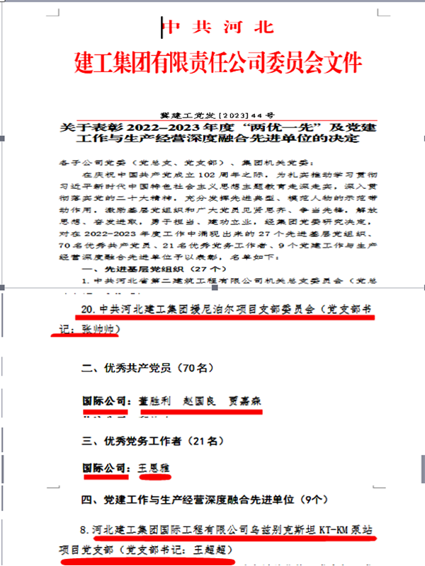 6月29日,河北建工集团党委庆祝建党102周年先进表彰暨主题教育推进会召开,2022-2023年度“两优一先”及党建工作与生产经营深度融合先进单位、优秀“党员工作室”评选结果揭晓,河北建工集团援尼泊尔项目党支部荣获先进基层党组织称号,董胜利、赵国良、贾嘉森3名同志荣获优秀共产党员称号,王恩雅同志荣获优秀党务工作者荣誉称号,华体网页版页面登录乌兹别克斯坦KT-KM泵站项目党支部荣获党建工作与生产经营深度融合先进单位荣誉称号,王建伟“党员创新工作室”荣获优秀“党员创新工作室”荣誉称号。