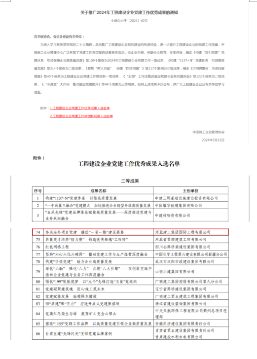 近日,从中国施工企业管理协会网站获悉,经企业申报、关联协会推荐、专家评审,2024年工程建设企业党建工作优秀成果揭晓,河北建工集团国际公司的党建工作成果《夯实海外项目党建 描绘“一带一路”建设画卷》入选,获二等成果。